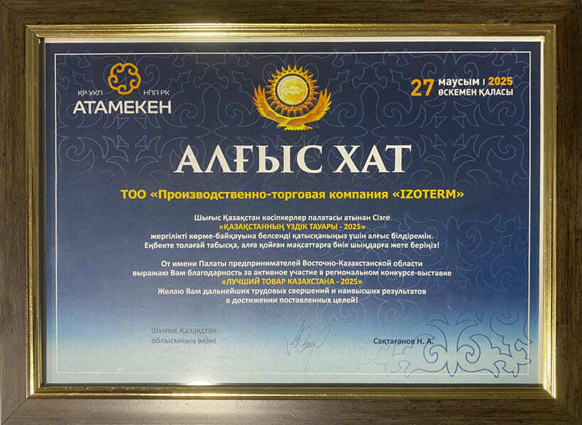 Звание «Лучший товар Казахстана» — это объективное, документальное подтверждение того, что утеплитель Izoterm превосходит аналоги по ключевым эксплуатационным характеристикам.